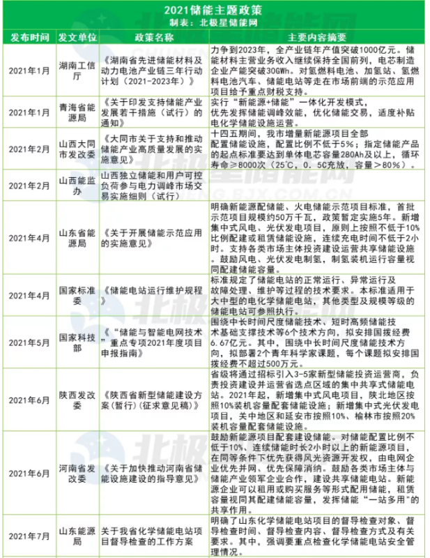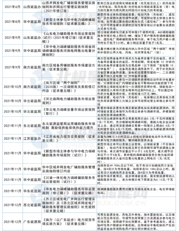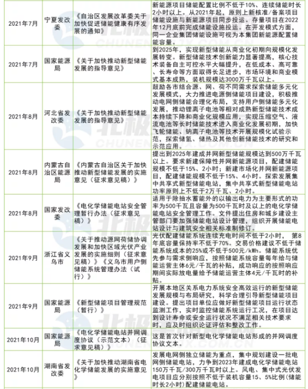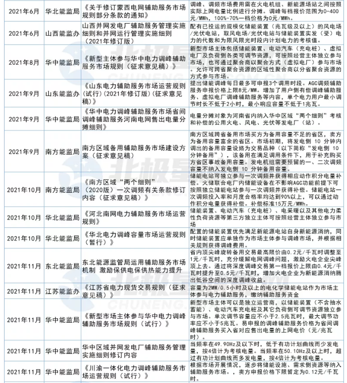 在雙碳戰(zhàn)略目標(biāo)下,能源清潔化是核心。2021年以來(lái)各地都陸續(xù)發(fā)布文件啟動(dòng)新能源“倍增計(jì)劃”,電源側(cè)多能互補(bǔ)、一體化、大基地模式成為新的發(fā)展趨勢(shì)。新能源發(fā)電的靠天吃飯?zhí)匦灾饾u成為其發(fā)展瓶頸,同時(shí)也是電源側(cè)儲(chǔ)能難以實(shí)現(xiàn)商業(yè)化的突破口。2021年全國(guó)各省市新能源配套儲(chǔ)能需求多達(dá)29項(xiàng),各地26項(xiàng)儲(chǔ)能主題文件中大多提及了鼓勵(lì)以共享或租賃形式建設(shè)儲(chǔ)能節(jié)約成本,但真正最有利的推手當(dāng)屬新版兩個(gè)細(xì)則。