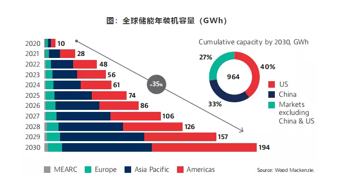 根據(jù)伍德·麥肯錫預(yù)測(cè),2021年至2030年期間,全球?qū)⑿略鰞?chǔ)能容量346.2GW/964GWh,其中一半以上分布在美國(guó)和中國(guó)。