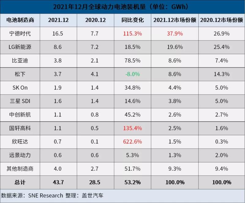 2021年12月,全球動力電池裝機(jī)量約為43.7 GWh,同比增長53.2%,連續(xù)第18個月增長。其中,寧德時(shí)代也延續(xù)了下半年的優(yōu)秀表現(xiàn),憑借16.5 GWh的裝機(jī)量和37.9%的市場份額再度領(lǐng)先;LG新能源仍居第二,市場份額下跌5.8個百分點(diǎn);在第4名松下的電池裝機(jī)量同比下降8%的情況下,比亞迪進(jìn)一步奪取其市場份額,并連續(xù)三月保持第3的排名不變。