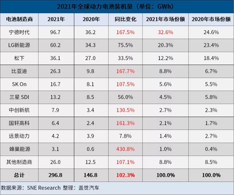 2021年全年,寧德時(shí)代、LG新能源和松下是電池裝機(jī)量年度榜單排名前3的電池制造商。寧德時(shí)代裝機(jī)量達(dá)96.7 GWh,市場份額近三分之一;但LG新能源和松下的市場份額分別下跌了3.1個百分點(diǎn)和6.2個百分點(diǎn)。第4名比亞迪的裝機(jī)量同比增加16.5 GWh,幾乎相當(dāng)于第5名SK On的年裝機(jī)量,也遠(yuǎn)超第6名三星SDI的年裝機(jī)量。