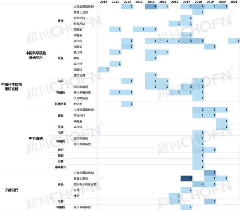 上圖可清晰的反映中科院物理所(中科海鈉)和寧德時(shí)代研究重點(diǎn)均在正極材料技術(shù)領(lǐng)域。