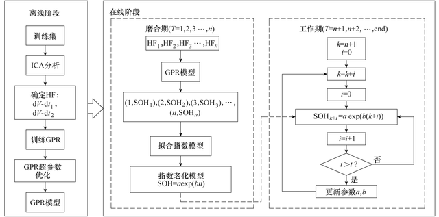 該方法分為離線(xiàn)與在線(xiàn)兩個(gè)階段。在離線(xiàn)階段,通過(guò)電池容量增量分析,提取與SOH相關(guān)性較高的兩個(gè)電壓升片段下所耗的時(shí)間dV-dt1與dV-dt2作為外部健康特征,并使用高斯過(guò)程回歸的方法對(duì)電池SOH的衰退進(jìn)行建模。將在線(xiàn)階段分為兩部分,在“磨合期”通過(guò)GPR模型對(duì)電池前部分周期的SOH進(jìn)行預(yù)測(cè),利用預(yù)測(cè)所得數(shù)據(jù)擬合指數(shù)模型,得到指數(shù)模型參數(shù)的初值;在“工作期”使用指數(shù)模型進(jìn)行SOH預(yù)測(cè),并利用觀(guān)測(cè)器每隔固定循環(huán)次數(shù)對(duì)指數(shù)模型的參數(shù)進(jìn)行修正。
