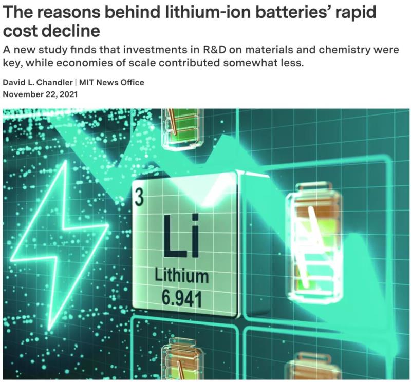 中國儲能網(wǎng)訊:麻省理工學(xué)院學(xué)者在《能源與環(huán)境科學(xué)》雜志發(fā)表論文,指出鋰離子電池是輕量化動力的奇跡,使當(dāng)今的手持電子產(chǎn)品和電動汽車時代成為可能。自30年前推出以來,鋰離子電池的成本大幅下降,降幅與太陽能電池板成本的下降速度相似。那么,是什么因素導(dǎo)致了如此驚人的成本下降,達到97%?