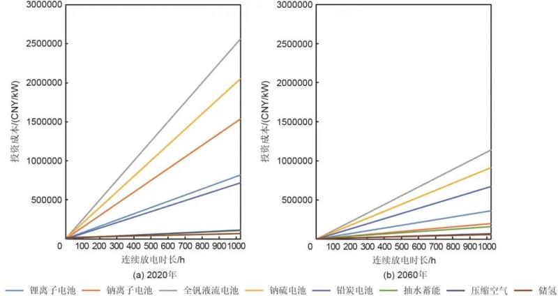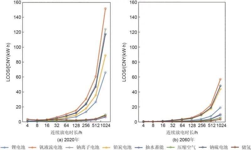 圖3 2020、2060年不同放電時(shí)長(zhǎng)儲(chǔ)能平準(zhǔn)化充放電成本