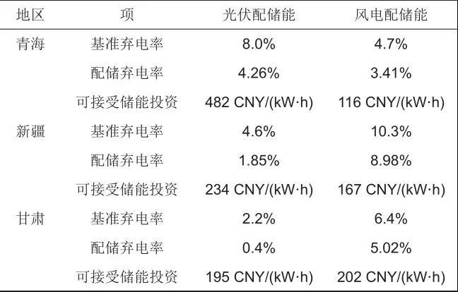 表2對(duì)比了在當(dāng)前棄電率水平下,青海、新疆、甘肅三省風(fēng)光配置儲(chǔ)能對(duì)消納能力提升的作用,以及在現(xiàn)有新能源上網(wǎng)電價(jià)水平下對(duì)儲(chǔ)能成本的最高接受度??梢钥闯雠渲脙?chǔ)能對(duì)提升光伏消納水平效果顯著,配置儲(chǔ)能后三省的光伏棄電率都有接近甚至超過50%的降幅。相比而言,配置儲(chǔ)能對(duì)減少棄風(fēng)的效果相對(duì)有限,在更多情況下,儲(chǔ)能并不能完全解決風(fēng)電連續(xù)出力導(dǎo)致的棄風(fēng)問題,整體棄風(fēng)率降幅區(qū)間為10%~28%。在配置儲(chǔ)能經(jīng)濟(jì)性方面,發(fā)現(xiàn)以當(dāng)前平價(jià)項(xiàng)目上網(wǎng)電價(jià)和棄電率水平,新能源配置儲(chǔ)能的成本接受度非常有限。因三個(gè)案例省份新能源出力特性、棄電基線、上網(wǎng)電價(jià)存在差異,可接受的儲(chǔ)能成本也各不相同,其中光伏配置儲(chǔ)能的成本接受度為195~482 CNY/(kW·h),而風(fēng)電配置儲(chǔ)能的成本接受度僅為116~202 CNY/(kW·h),遠(yuǎn)低于目前鋰電池單位投資水平。可見對(duì)于新能源發(fā)電站內(nèi)配儲(chǔ),目前鋰電池儲(chǔ)能經(jīng)濟(jì)性偏低。
