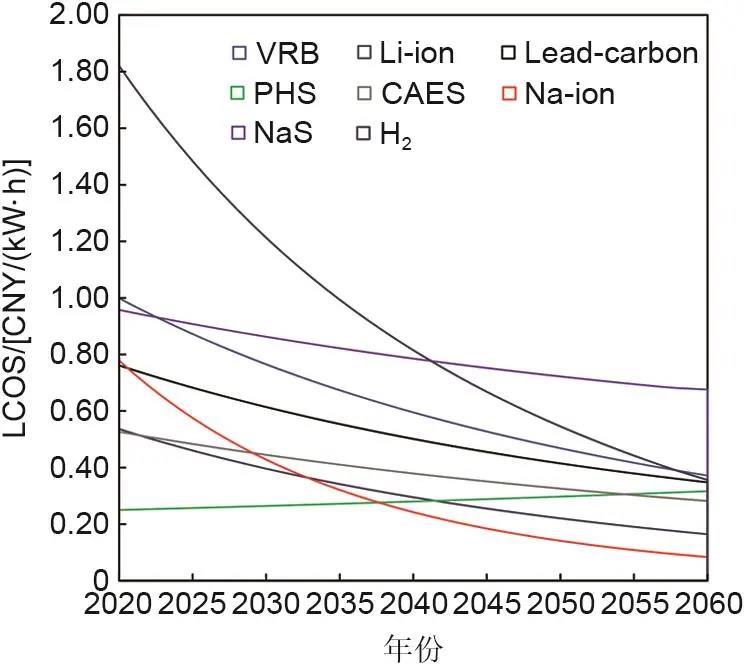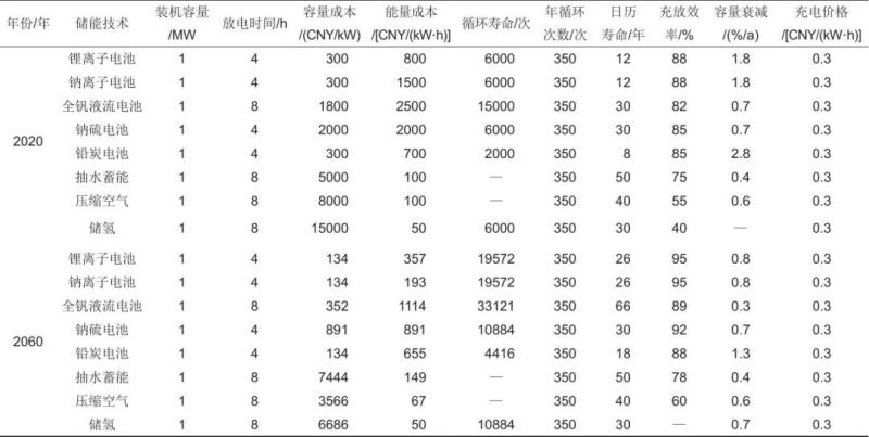 表1 2020年、2060年儲(chǔ)能技術(shù)經(jīng)濟(jì)性參數(shù)假設(shè)