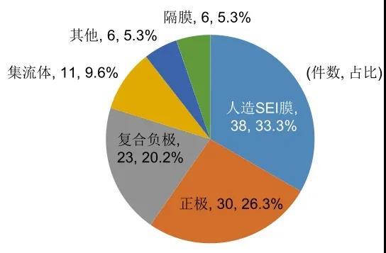石墨烯在鋰金屬電池中主要應(yīng)用于人造SEI膜、正極、復(fù)合負(fù)極、集流體、隔膜等結(jié)構(gòu)部件。由圖25可知,石墨烯應(yīng)用于人造SEI膜中的專利申請量最多,占比為33.3%,其次為在鋰金屬電池正極中專利申請量較多,占比26.3%。石墨烯應(yīng)用于人造SEI膜中有利于鋰離子和電子的擴(kuò)散與傳遞,緩解充放電過程中的金屬鋰體積變化和鋰枝晶的生成,避免生成死鋰以及防止枝晶刺穿隔膜,從而提高金屬鋰負(fù)極的循環(huán)穩(wěn)定性和倍率性能。