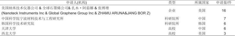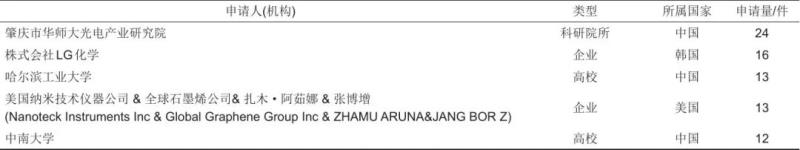 從專利申請人(機(jī)構(gòu))類型來看,高校和科研院所的專利申請量遠(yuǎn)超企業(yè)申請人(機(jī)構(gòu))。而縱觀整個超級電容器領(lǐng)域,專利申請量一向排名靠前的松下電器、日本貴彌功株式會社、明電舍株式會社、旭硝子株式會社、寧波中車新能源科技有限公司等,均未出現(xiàn)在上述重要申請人(機(jī)構(gòu))之中??梢姡壳俺夒娙萜髌髽I(yè)還未針對石墨烯在超級電容器領(lǐng)域應(yīng)用展開大面積的專利布局。