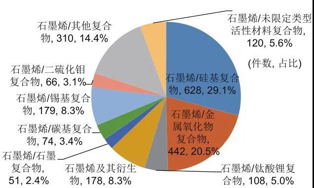 鋰離子電池負(fù)極中,石墨烯應(yīng)用方式通常有兩類,一類是將石墨烯直接作為活性材料;一類是將石墨烯與活性材料復(fù)合,以緩解活性材料在充放電過程中的體積變化,改善活性材料導(dǎo)電性。由圖10可知,直接使用石墨烯及其衍生物作為負(fù)極活性材料的專利實(shí)際上占比很少,僅為8.3%。石墨烯與硅基材料、金屬氧化物復(fù)合,尤其是與硅基材料復(fù)合是專利申請最為集中的領(lǐng)域。硅基負(fù)極材料因其具有較高理論比容量,被視為比較理想的下一代鋰離子電池負(fù)極材料,不少負(fù)極材料生產(chǎn)企業(yè)均已開始布局硅基負(fù)極的開發(fā)與商業(yè)化。可見,石墨烯及其衍生物在鋰離子電池電極材料中大多數(shù)還是以與其他活性成分復(fù)合的方式存在,將石墨烯及其衍生物作為電極材料的專利申請量僅占少數(shù)??梢?,如何讓石墨烯在儲能體系中發(fā)揮其最大效用仍然是研發(fā)人員需要解決的技術(shù)難題。需要說明的是,部分專利文獻(xiàn)中對與石墨烯復(fù)合的活性材料類型沒有特殊限定,在圖10和圖11中將此類專利歸類為“石墨烯/未限定類型活性材料復(fù)合物”,圖10中此類專利有120件,占比5.6%。