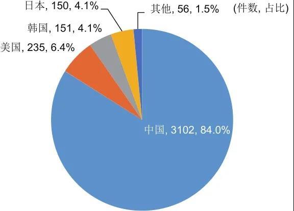由圖6可知,石墨烯在鋰離子電池領(lǐng)域應(yīng)用專利申請人(機(jī)構(gòu))中,中國是主要專利技術(shù)來源國,申請總量達(dá)3102件,占比84.0%,其次為美國、韓國、日本,分別占比6.4%、4.1%、4.1%。縱觀整個鋰離子電池材料領(lǐng)域,日本、韓國兩國占有技術(shù)優(yōu)勢并擁有可觀的專利儲量。然而在石墨烯應(yīng)用于鋰離子電池這一技術(shù)路線中,日韓兩國則顯得較為謹(jǐn)慎,在該領(lǐng)域的專利申請量遠(yuǎn)低于中國。