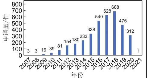 專利申請數(shù)量體現(xiàn)的是知識產(chǎn)權(quán)制度中專利技術(shù)的確權(quán)與保護(hù),由于技術(shù)的發(fā)展必然伴隨著專利的產(chǎn)生,以專利數(shù)量作為統(tǒng)計(jì)指標(biāo)能夠一定程度上體現(xiàn)石墨烯在儲能領(lǐng)域應(yīng)用的研發(fā)熱點(diǎn)和發(fā)展態(tài)勢。