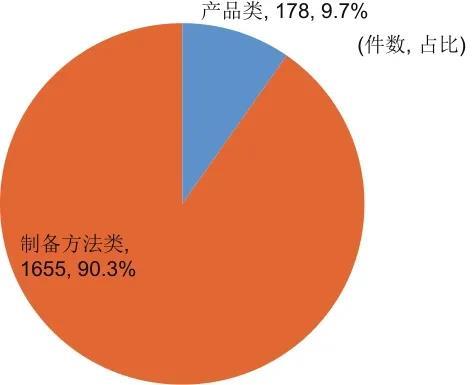 人工分析其中1833件有效專利文本的獨(dú)立權(quán)利要求后獲得圖4。從保護(hù)主題來看,有效專利文本中有90.3%的專利為制造方法類專利,產(chǎn)品類專利僅占9.7%。