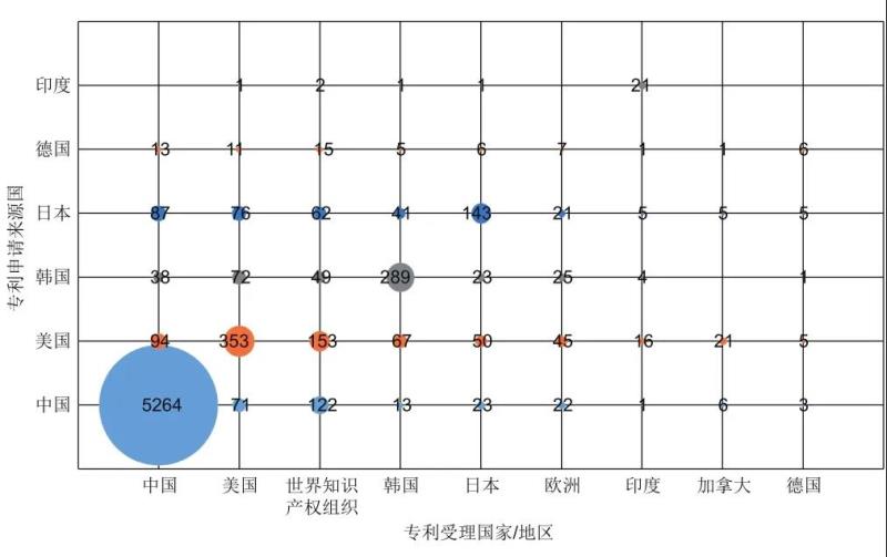 分析一件專利的申請來源國及對應(yīng)的專利受理國,可以知道專利技術(shù)的輸入輸出情況(機(jī)構(gòu))。如圖3所示,中國申請人(機(jī)構(gòu))在本國的申請量最大,在海外的申請量比例明顯偏低。美國、韓國和日本申請人(機(jī)構(gòu))在本國和海外均有較多的專利申請。各國均較為重視在美國的專利布局,通過世界知識產(chǎn)權(quán)局提交專利申請是各國進(jìn)行海外專利布局的重要途徑。