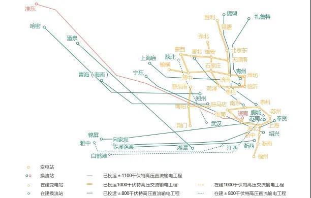 其中,國家電網(wǎng)新疆(準東)—華東(皖南)±1100千伏特高壓直流輸電工程是世界上電壓等級最高、輸送容量最大、輸送距離最遠、技術(shù)水平最先進的特高壓輸電工程,換流容量2400萬千瓦,線路長度3324Km,途經(jīng)新疆、甘肅、寧夏、陜西、河南、安徽6?。▍^(qū)),工程總投資407億元人民幣。