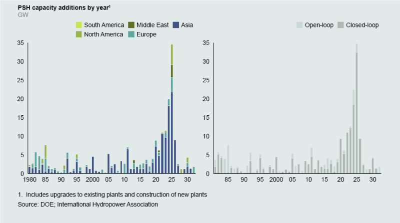 大型抽水蓄能發(fā)電設(shè)施可以提供低成本、可調(diào)度的電力,并且由于其快速響應(yīng)時(shí)間而作為電網(wǎng)穩(wěn)定性的主要解決方案。它的主要限制是缺乏可用場(chǎng)地、交貨時(shí)間長、建設(shè)成本高以及環(huán)境問題。盡管如此,它仍有潛力滿足日益增長的電氣化需求和對(duì)零碳能源的需求,并促進(jìn)難以減排的行業(yè)脫碳,特別是在擁有大部分未開發(fā)自然潛力且電力需求可能成倍增加的新興經(jīng)濟(jì)體中。