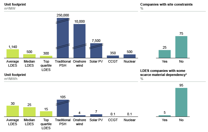 大多數(shù)新興的長時(shí)儲(chǔ)能技術(shù)幾乎沒有部署限制(如圖8所示)。例如,這些長時(shí)儲(chǔ)能系統(tǒng)沒有特定的地理位置要求,并且每個(gè)裝機(jī)容量的占地面積較小。根據(jù)長時(shí)儲(chǔ)能技術(shù)的不同特點(diǎn),有些長時(shí)儲(chǔ)能系統(tǒng)可以建在地下或非常靠近人口稠密的地區(qū),因?yàn)樗鼈兊陌踩L(fēng)險(xiǎn)低。