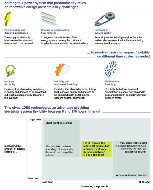 持續(xù)時(shí)間將從12小時(shí)延伸到持續(xù)數(shù)天或數(shù)周。需要解決長期不平衡的可再生能源輸出或由輸電限制引起的潛在中斷。傳統(tǒng)上,電力系統(tǒng)依賴于傳統(tǒng)發(fā)電廠、電力供應(yīng)縮減和輸電網(wǎng)規(guī)模的擴(kuò)張。長時(shí)儲(chǔ)能技術(shù)是一種有前途的零碳解決方案,可以滿足這些長期靈活性需求,尤其是那些持續(xù)數(shù)天的電力需求。