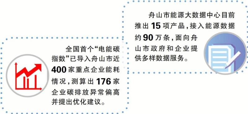 2021年4月,舟山供電公司主動對接國網(wǎng)浙江省電力有限公司和舟山市政府發(fā)改部門,依托省級能源大數(shù)據(jù)中心,建設(shè)“面向政府機構(gòu)、面向能源行業(yè)、面向社會公眾”的舟山市能源大數(shù)據(jù)中心,在浙江率先完成首個基于省級能源大數(shù)據(jù)中心的地市級平臺開發(fā)上線。進入舟山市能源大數(shù)據(jù)中心,一塊科技感十足的巨大屏幕格外引人注目,大屏幕上的“能源看雙碳”板塊上顯示著各級“電能碳指數(shù)”。大到舟山市兩縣兩區(qū),小到一家企業(yè),都有自己的專屬“電能碳指數(shù)”,將“電能碳指數(shù)”與當(dāng)天的實時用電量相乘,便能得出當(dāng)天的碳排放量。