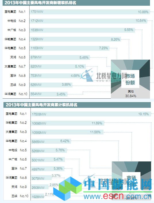 2013 年,風(fēng)電新增裝機(jī)排名中,國電集團(tuán)繼續(xù)保持其領(lǐng)先地位,中電投、中廣核緊隨其后,在風(fēng)電累計(jì)裝機(jī)中,僅國電集團(tuán)累計(jì)裝機(jī)容量超過15000MW,達(dá)到17508MW,占全國累計(jì)裝機(jī)總量的19.2%,其次分別為華能和大唐集團(tuán),裝機(jī)容量軍突破10000MW,所占市場份額分別為11.7%和11.6%。前十名風(fēng)電開發(fā)商的市場份額進(jìn)一步提升,三峽和天潤近幾年新增裝機(jī)增速較快,替代京能和新天綠色能源進(jìn)入前10名。