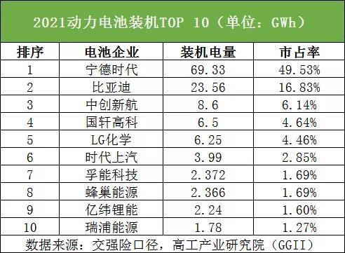 其中,寧德時代2021年動力電池裝機量69.33GWh,同比增長132%,國內(nèi)市場占有率達到49.53%,領(lǐng)先第二名比亞迪市占率超32%。