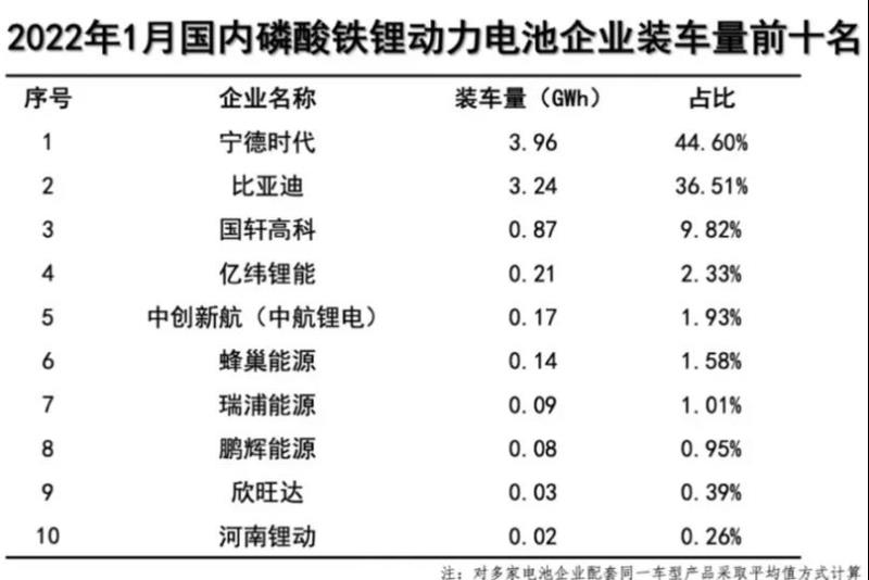 2022年1月,我國磷酸鐵鋰動力電池企業(yè)裝車量前十名分別為:寧德時(shí)代、比亞迪、國軒高科、億緯鋰能、中創(chuàng)新航、蜂巢能源、瑞浦能源、鵬輝能源、欣旺達(dá)、河南鋰動。