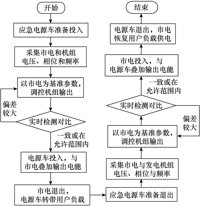 一旦市電突然異?;蚬收鲜щ?,則斷開低壓用戶總開關,由應急電源車單獨為用戶負載供電。當市電恢復時,并網裝置一旦檢測到符合并網條件的情況,就會提示現(xiàn)場人員,此時手動合上用戶總開關。保電工作結束后,關停發(fā)電機組并斷開并網開關,然后帶電拆除檢測線和匯流夾鉗。整個供電保障全過程中,實現(xiàn)了用戶無感知用電。