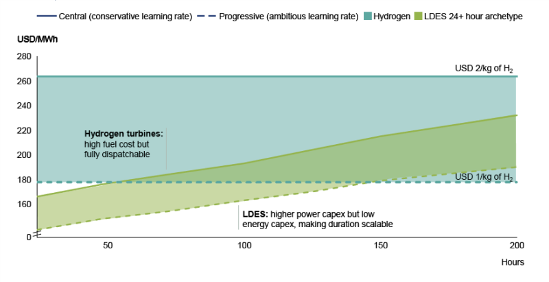 ?到2030年,持續(xù)時間150小時的長時儲能可以與相同規(guī)模的氫能設(shè)施在平準(zhǔn)化成本(LCOS)方面進(jìn)行競爭。