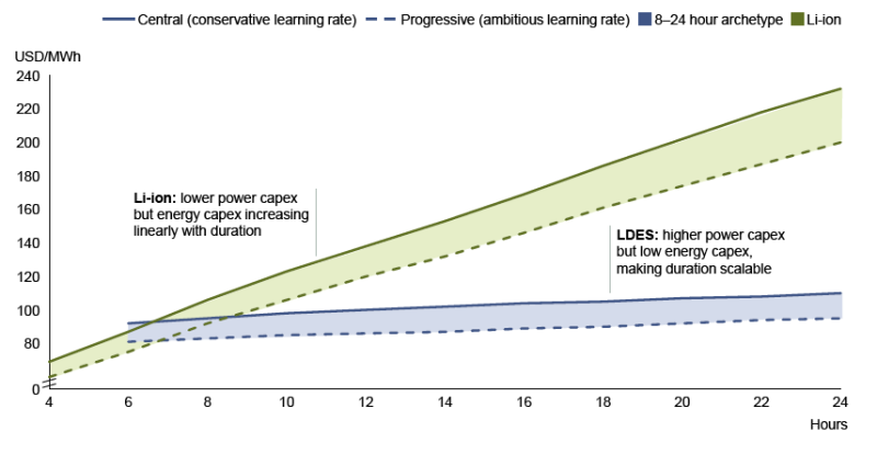 如今,一些長時儲能技術(shù)在數(shù)量有限但不斷增加的應(yīng)用中具有競爭力。長時儲能系統(tǒng)的平準(zhǔn)化成本(LCOS)的分析表明,如果實(shí)現(xiàn)這樣的下降曲線,6小時以上到150小時持續(xù)時間的長時儲能具有成本競爭力。