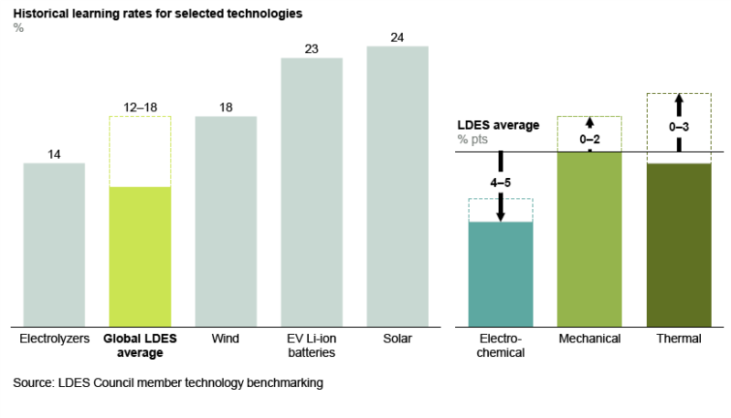 長時儲能通常都是新興技術(shù),隨著部署規(guī)模的擴(kuò)大,將會降低成本。長時儲能委員會表示,長時儲能資本支出的成本下降曲線在12%到18%之間,并與海上風(fēng)能和電池等其他類似的突破性能源技術(shù)一致。技術(shù)發(fā)展和擴(kuò)大運(yùn)營規(guī)模將是成本改善的最大驅(qū)動力。