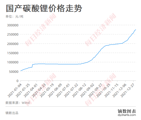 Wind數(shù)據(jù)顯示,2021年1月4日國產(chǎn)碳酸鋰市場均價(jià)為5.3萬元/噸,到了2021年12月31日,這一價(jià)格漲到了27.5萬元/噸,一年時(shí)間內(nèi),價(jià)格漲幅已經(jīng)超過4倍。