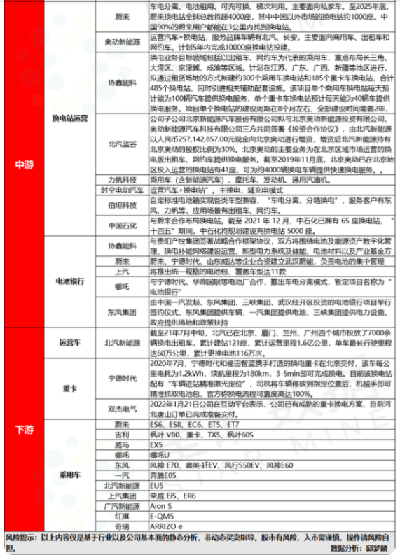 換電站產業(yè)鏈的上游為換電站建設,主要包括基礎零部件、換電系統(tǒng)、充電系統(tǒng)和動力電池。中游主要是換電站的運營,主要參與者是主機整車商、運營商、電池資產管理公司(電池銀行)和電池回收,梯次應用;下游面對的是換電站的使用者,劃分為To B公交車、出租車、網約車、重卡;以及To C的乘用車。