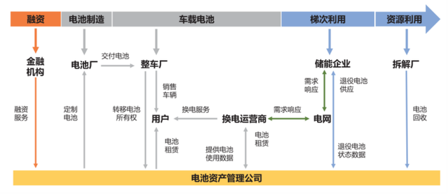 金融機構提供融資方案;電池供應商和整車廠、換電運營商之間通過定制和租/購完成電池交付,以及電池數據交換完成統(tǒng)一管理,排除安全隱患;