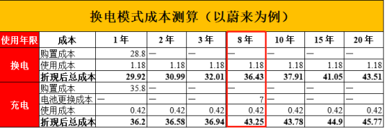以蔚來為例,一輛35.8萬元的充電模式車型,單獨疊加充電成本,折現總成本也是逐年上升的;但如果使用電池租用模式,初始購置價格僅為28.8萬元,疊加電池租用成本,直到第8年,折現后的總成本才會超過充電模式的購置成本。很顯然,對于3~5年內就有升級或換車需求的用戶來說,車電分離的換電模式更加具有性價比。