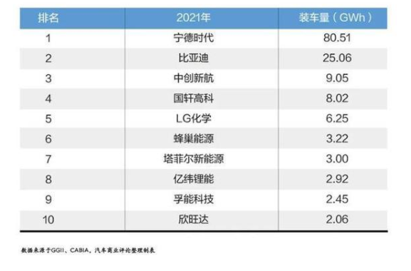 2021年,我國動(dòng)力電池裝車量TOP10企業(yè)依次為寧德時(shí)代(占比52.1%)、比亞迪(占比16.2%)、中創(chuàng)新航(占比5.9%)、國軒高科(占比5.2%)、LG化學(xué)(占比5.2%)、蜂巢能源(占比2.1%)、億緯鋰能(占比1.9%)、塔菲爾新能源(占比1.9%)、孚能科技(占比1.6%)、欣旺達(dá)(占比1.3%)。
