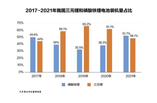 總結(jié)一下:2017年,磷酸鐵鋰電池占比超過三元鋰電池。此后,2018年,三元鋰反超磷酸鐵鋰。2019年,三元鋰占比達(dá)到磷酸鐵鋰的兩倍。2020年,磷酸鐵鋰占比稍有上升,但仍低于三元鋰。2021年,磷酸鐵鋰強(qiáng)勢反彈,占比再次超過三元鋰。