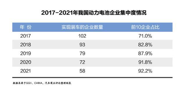綜合GGII和CABIA的數(shù)據(jù),2018-2021年,我國實(shí)現(xiàn)裝車配套的動(dòng)力電池企業(yè)數(shù)量分別為102家、93家、79家、72家、58家,排名前10企業(yè)動(dòng)力電池裝車量占比依次為82.8%、87.9%、91.8%、92.2%。