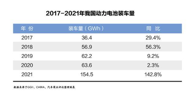 根據(jù)中國汽車動(dòng)力電池產(chǎn)業(yè)創(chuàng)新聯(lián)盟(CABIA)的數(shù)據(jù),2021年,我國動(dòng)力電池裝車量達(dá)到154.5GWh,同比暴增142.8%。這背后是同年新能源汽車年銷量達(dá)到352.1萬輛,同比增長157.5%。