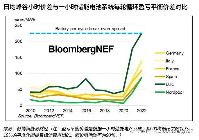 價差一直在上升,目前在部分市場已經(jīng)接近對儲能電池系統(tǒng)具有吸引力的水平。歐洲主要電力市場的日前套利價差已經(jīng)大幅擴大,特別是在英國市場。自2020年至2022年,日均峰谷小時價差增長四倍,從25歐元/MWh升至126歐元/MWh。英國價差擴大幅度最大,2021年均值為177歐元/MWh,而2022年迄今為止的均值為225歐元/MWh,高于2010-2020年51歐元/MWh的長期平均值。