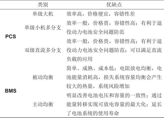 常規(guī)PCS和BMS被動(dòng)均衡無(wú)法解決退役動(dòng)力電池運(yùn)行過(guò)程一致性發(fā)散的問(wèn)題,導(dǎo)致模塊利用率低。需要采用退役電池的專用拓?fù)浣Y(jié)構(gòu)和BMS均衡策略,例如單雙級(jí)混合式拓?fù)?、直流多分支兩?jí)拓?fù)?、BMS主動(dòng)均衡等,防范和抑制退役動(dòng)力電池安全問(wèn)題,PCS與BMS設(shè)備類型對(duì)比,見(jiàn)表2。