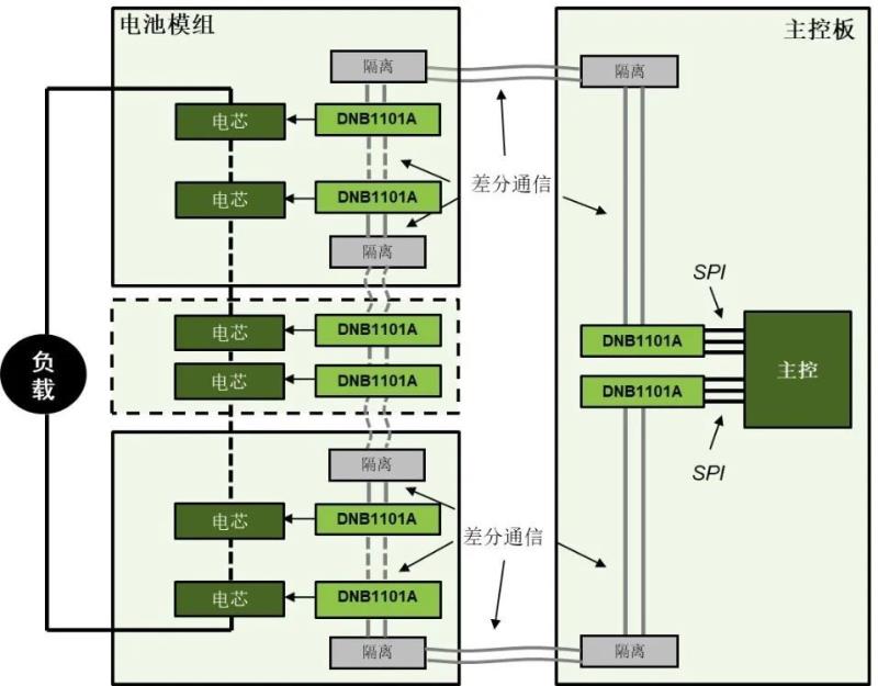 DNB1101A為每個(gè)單獨(dú)的電芯或并聯(lián)的一組電芯提供多種傳感功能,包括電壓監(jiān)測(cè)、溫度監(jiān)測(cè)和電化學(xué)阻抗譜(EIS)監(jiān)測(cè)。通過差分菊花鏈,電池參數(shù)信息被傳輸?shù)诫姵亟M控制器。鏈中的第一顆芯片將標(biāo)準(zhǔn)SPI信號(hào)轉(zhuǎn)換為菊花鏈差分信號(hào),反之亦然。芯片支持環(huán)形通信架構(gòu)。