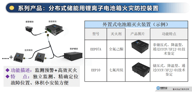 中科久安基于電池?zé)崾Э啬P?、系列?shí)驗(yàn)測(cè)試,研發(fā)出多參數(shù)耦合電池火災(zāi)預(yù)警技術(shù)及裝備產(chǎn)品,實(shí)現(xiàn)對(duì)鋰離子電池系統(tǒng)火災(zāi)的早期感知、智能判斷和三級(jí)預(yù)警功能,同時(shí)通過(guò)理論分析和大量實(shí)驗(yàn)研究遴選出清潔高效滅火劑,突破傳統(tǒng)設(shè)計(jì),創(chuàng)新滅火方法(首次快速釋放、而后多次緩釋),實(shí)現(xiàn)快速滅火,有效解決降溫和復(fù)燃問(wèn)題。