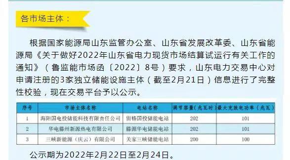 除國家電投山東海陽儲能電站外,還有華電滕州新源熱電有限公司滕源華電儲能電站和三峽新能源(慶云)關家三峽儲能電站也被納入山東省電力現(xiàn)貨市場。