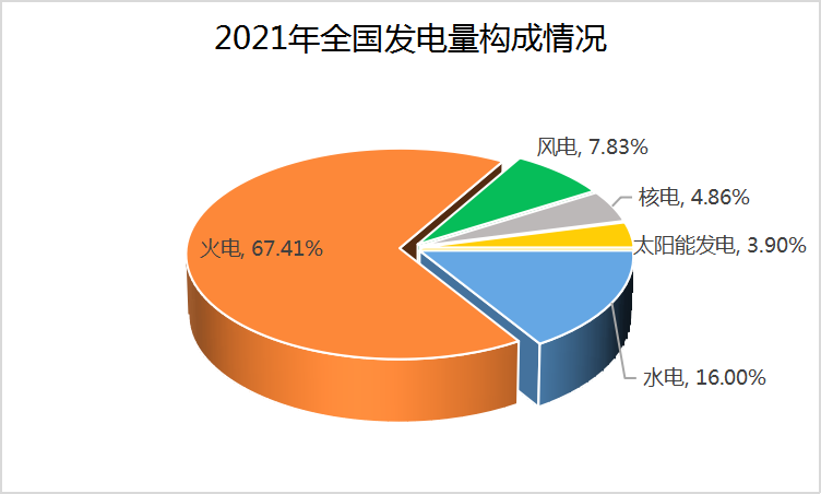 2021年全國水電、火電、核電、風(fēng)電、光伏發(fā)電的發(fā)電量分別為13401、56463、4075、6556和3270億千瓦時,合計83768億千瓦時。
