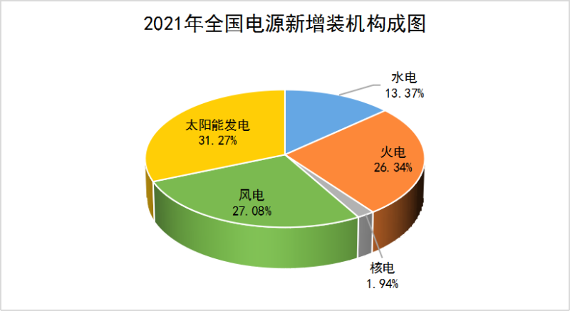 2021年,全國水電、火電、核電、風(fēng)電、光伏的裝機容量分別新增2349、4628、340、4757和5493萬千瓦,合計17629萬千瓦。