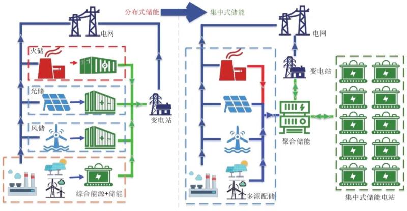 雙碳目標理念引領著新能源行業(yè)大規(guī)模滲透到電力系統(tǒng),而新能源電站配備儲能電站已經(jīng)是行業(yè)共識和實際需要。國家能源局也在大力推崇一站式綜合能源示范園區(qū),儲能系統(tǒng)也成為風光荷電儲中的重要一環(huán)。“儲能+”發(fā)展理念應運而生,“儲能+傳統(tǒng)發(fā)電”改善機組性能,提高負荷需求響應速度;“儲能+新能源發(fā)電”減少了棄光棄風現(xiàn)象,提高新能源利用效率,平緩過渡;“儲能+電網(wǎng)”減少區(qū)域控制誤差,削弱新能源并網(wǎng)影響;“儲能+用戶”降低用電成本。因此,儲能的發(fā)展勢必呈現(xiàn)集中式服務和分布式服務的情形,如圖1所示。電力系統(tǒng)常在火電、風電、光伏、綜合能源園區(qū)等領域配備一定容量的儲能,一般而言,各儲能系統(tǒng)作為獨立個體只服務所配套設施。若發(fā)電設備發(fā)生停機維護或未中標低負荷運行時,儲能設備則處于閑置或半閑置狀態(tài),尤其是太過依賴于外界因素的新能源經(jīng)常發(fā)生擺停、假停等現(xiàn)象,從而造成儲能閑置率較高,設備資源利用率低下。當分布式儲能的裝機容量在電力系統(tǒng)中占據(jù)一定比重時,無形增加了發(fā)電成本,且使用效率低下,無法充分發(fā)揮儲能的潛力作用。若將分布式儲能通過某種聚攏技術進行聯(lián)合調(diào)控,閑置儲能將得到合理利用,存儲局部電網(wǎng)調(diào)節(jié)余量,打破各個傳統(tǒng)儲能系統(tǒng)之間壁壘,有助于電網(wǎng)和發(fā)電行業(yè)進行聯(lián)合運行調(diào)控,提高電能品質(zhì)和儲能系統(tǒng)利用率。