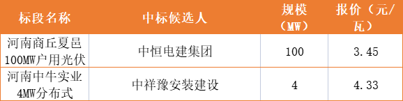 河南整縣項(xiàng)目分為100MW戶用光伏與4MW分布式項(xiàng)目,其中戶用光伏項(xiàng)目中標(biāo)企業(yè)為中恒電建,報(bào)價(jià)3.45元/瓦,分布式項(xiàng)目則報(bào)價(jià)相對較高,達(dá)到了 4.33元/瓦。