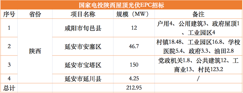 陜西4縣項(xiàng)目分別為咸陽市旬邑縣、延安市安塞區(qū)、寶塔區(qū)、延川縣,其規(guī)??傆?jì)為213MW。各縣項(xiàng)目又分別就政府屋頂、公用建筑屋頂、工業(yè)園區(qū)/彩鋼瓦、戶用光伏等四類不同類型屋頂明確了具體的規(guī)模。