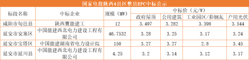從中標(biāo)結(jié)果來看,國家電投陜西4縣整縣光伏項(xiàng)目的中標(biāo)人基本為中國能建旗下企業(yè),僅旬邑縣標(biāo)段由陜西置能建工中標(biāo)。