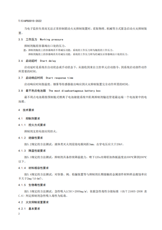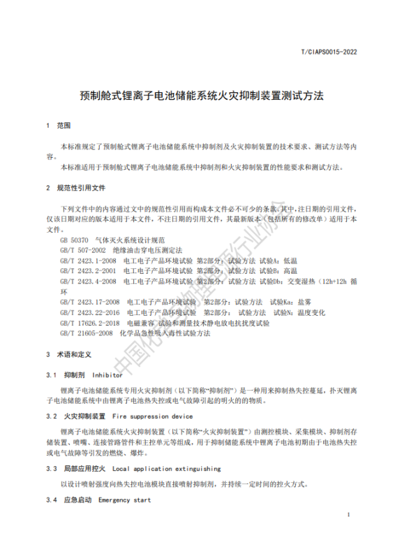 本標(biāo)準(zhǔn)適用于預(yù)制艙式鋰離子電池儲(chǔ)能系統(tǒng)中抑制劑和火災(zāi)抑制裝置的性能要求和測(cè)試方法。