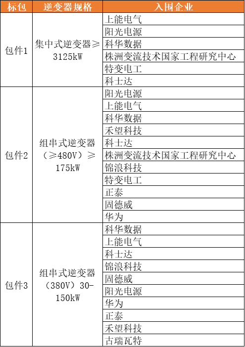 逆變器方面:共分3個包件,招標規(guī)格要求≥3125kW集中式逆變器、≥175kW組串式逆變器(≥480V)、30-150kW組串式逆變器(380V)。其中,科華、陽光電源、華為、上能電氣、特變電工、錦浪科技、固德威等企業(yè)入圍。具體入圍情況如下: